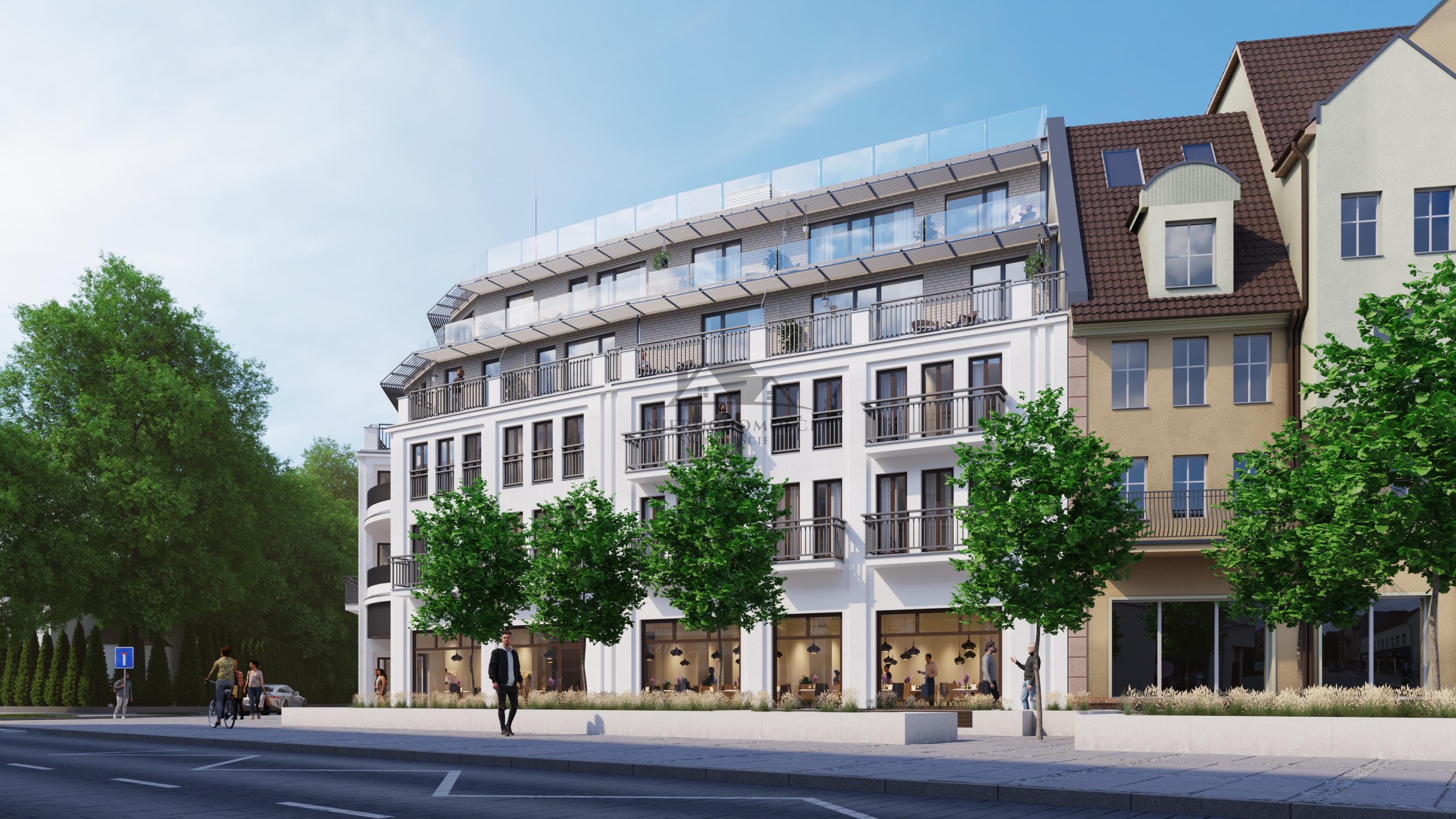 Mieszczący się nowy budynek przy Placu Wolności wykonany w standardzie premium mieści 4 piętra mieszkań, na parterze będą znajdować się lokale usługowe.