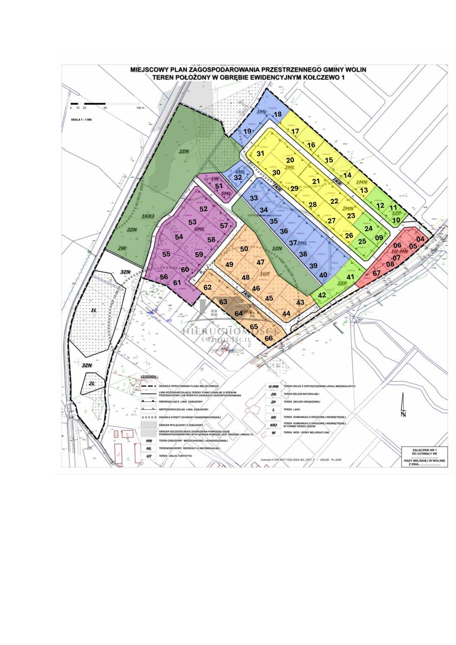 Na mapce z kolorami pozaznaczane są numery działek wraz z wielkością oraz ceną za m2